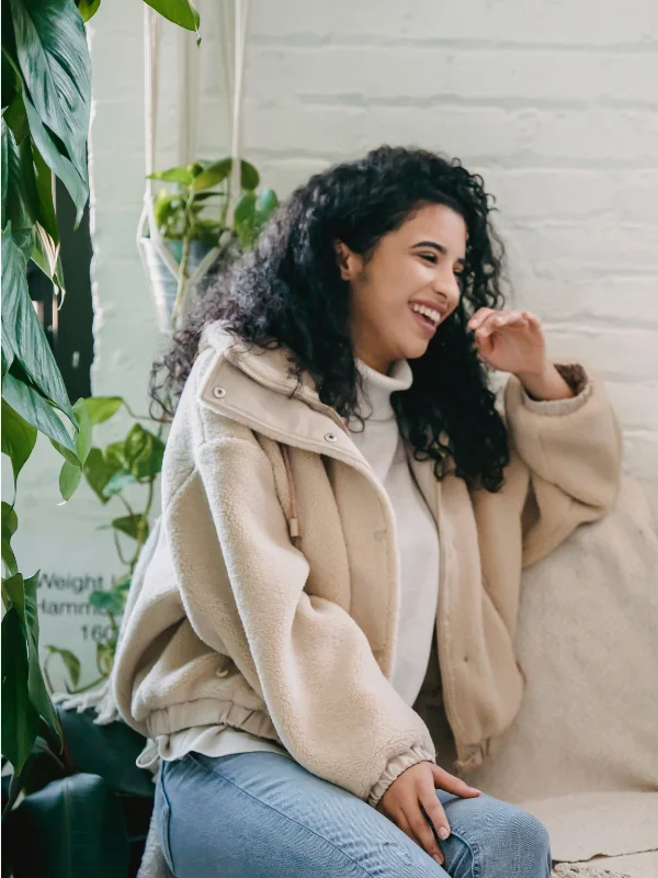 Attachment-Based Therapy Calgary - A young woman laughs while sitting on a couch.